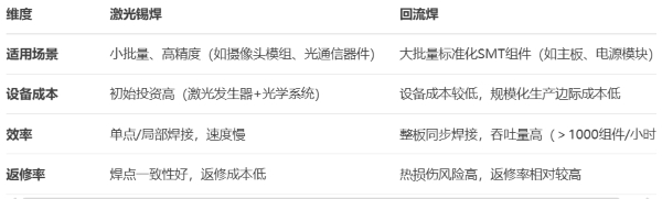 激光锡焊可穿透氧化层焊接难熔金属(如铝、钛合金),对表面处理要求低;回流焊依赖锡膏特性,对焊盘清洁度要求高。